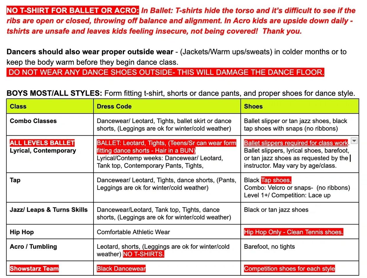 When an instructor can see a students’ arms, legs, hips and knee joints- they are able to intervene and correct form more easily. Dance styles have different dress codes to bring out the best in that dance style. Instructors have permission to make changes to the dress code as they feel necessary through the year.